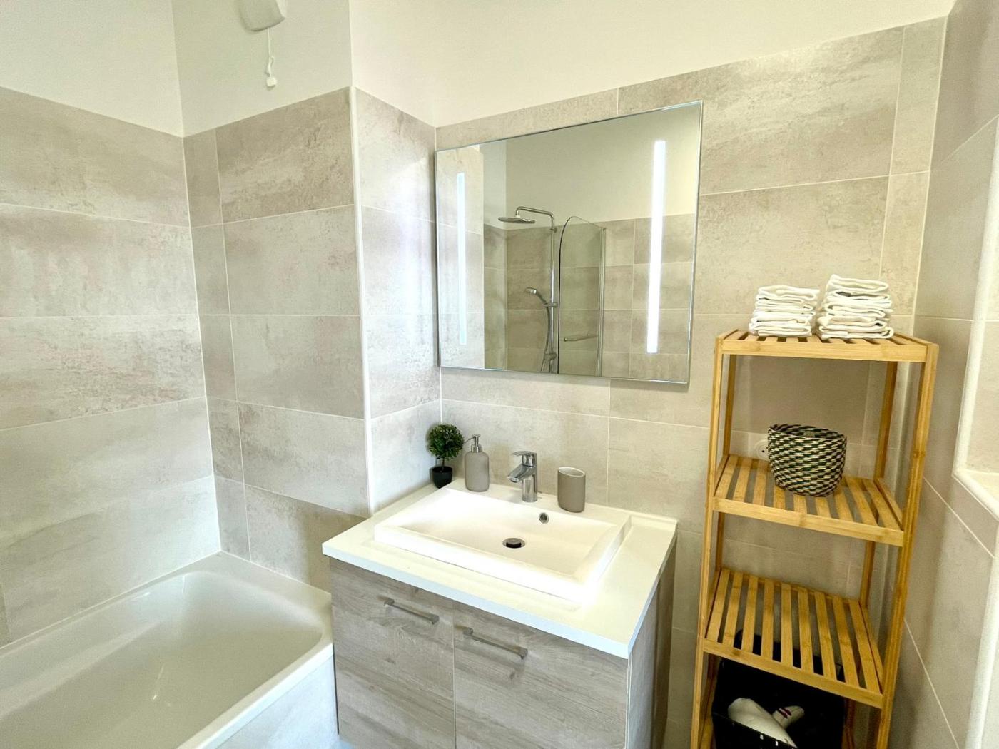 One-Bedroom Apartment. The air-conditioned apartment features 1 bedroom and 1 bathroom with a bath and a shower. The well-fitted kitchen has a stovetop, a refrigerator, kitchenware and a microwave. The apartment provides a washing machine, a coffee machine, a seating area as well as a balcony with city views. The unit offers 1 bed.