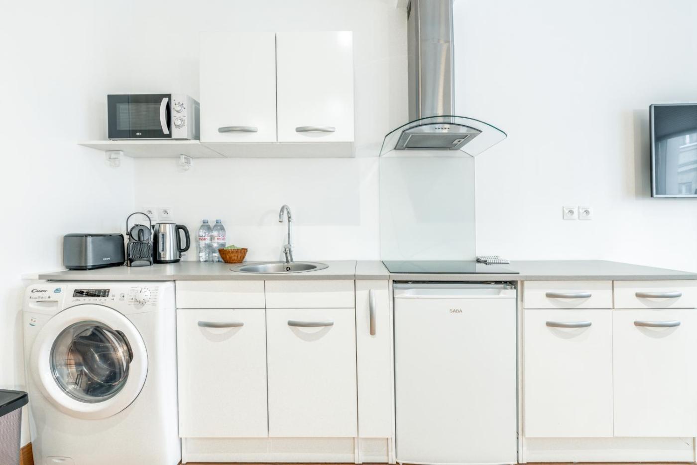 Deluxe One-Bedroom Apartment. This apartment includes 1 living room, 1 separate bedroom and 1 bathroom with a walk-in shower and free toiletries. Guests can make meals in the kitchen that is fitted with a stovetop, a refrigerator, an oven and a microwave. The apartment has parquet floors, a seating area with a flat-screen TV, a washing machine, soundproof walls as well as city views. The unit has 2 beds.